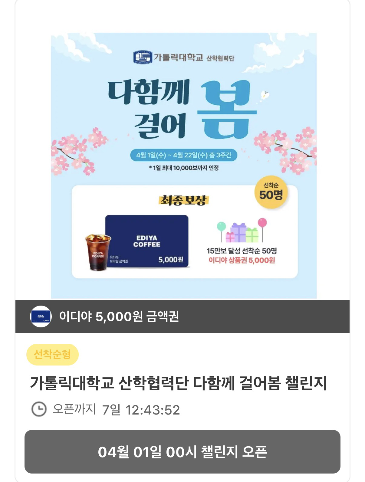 참여혜택 | • 운영기간 동안 누적 150,000보 달성한 선착순 100명 (산학연구원 50명 / 행정직원 50명) '이디야 커피 5000원 쿠폰'을 최종 보상으로 지급 예정 |