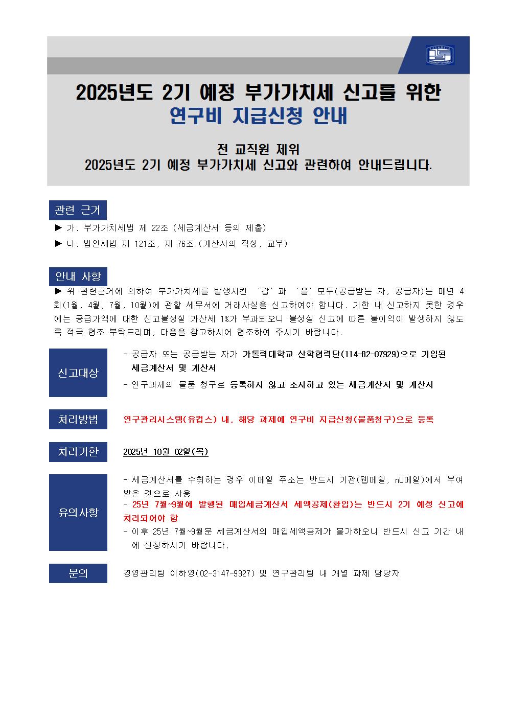2025년도 2기 예정 부가가치세 신고를 위한 연구비 지급신청 안내