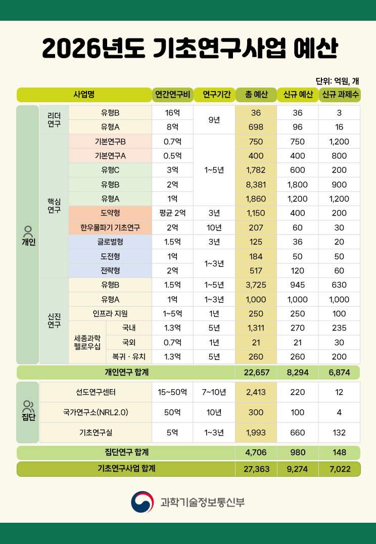 [과기정통부] 2026년도 기초연구사업 예산 및 공고 일정